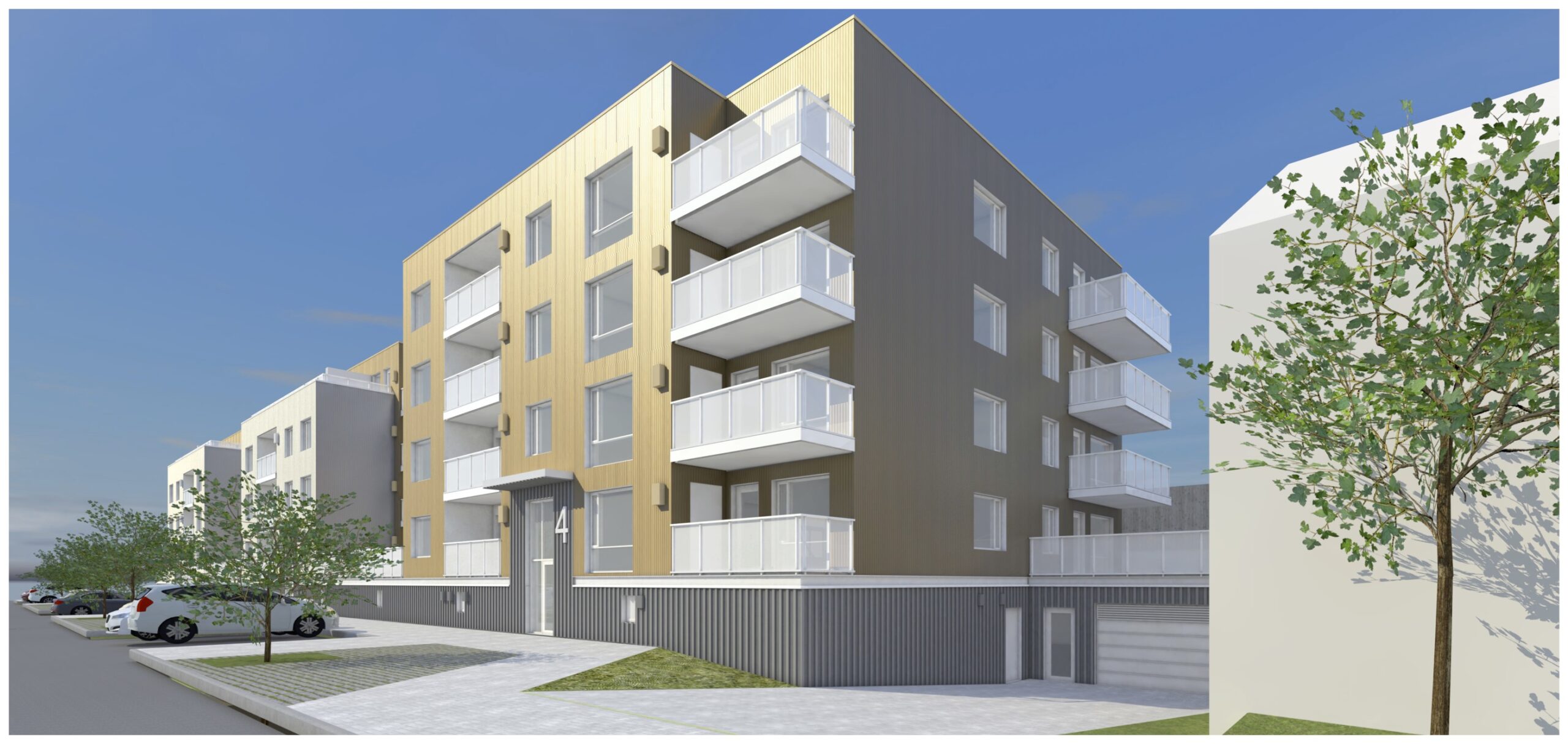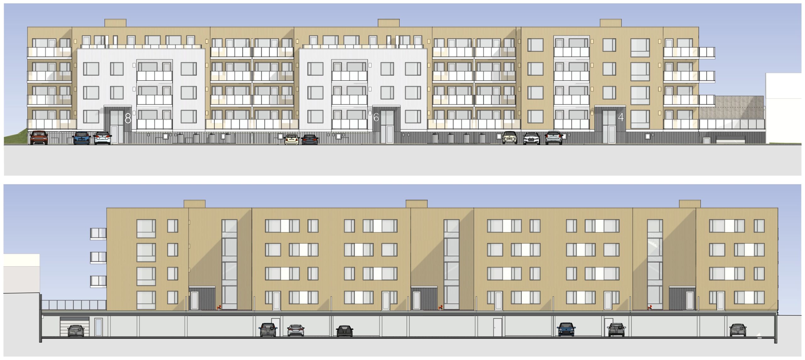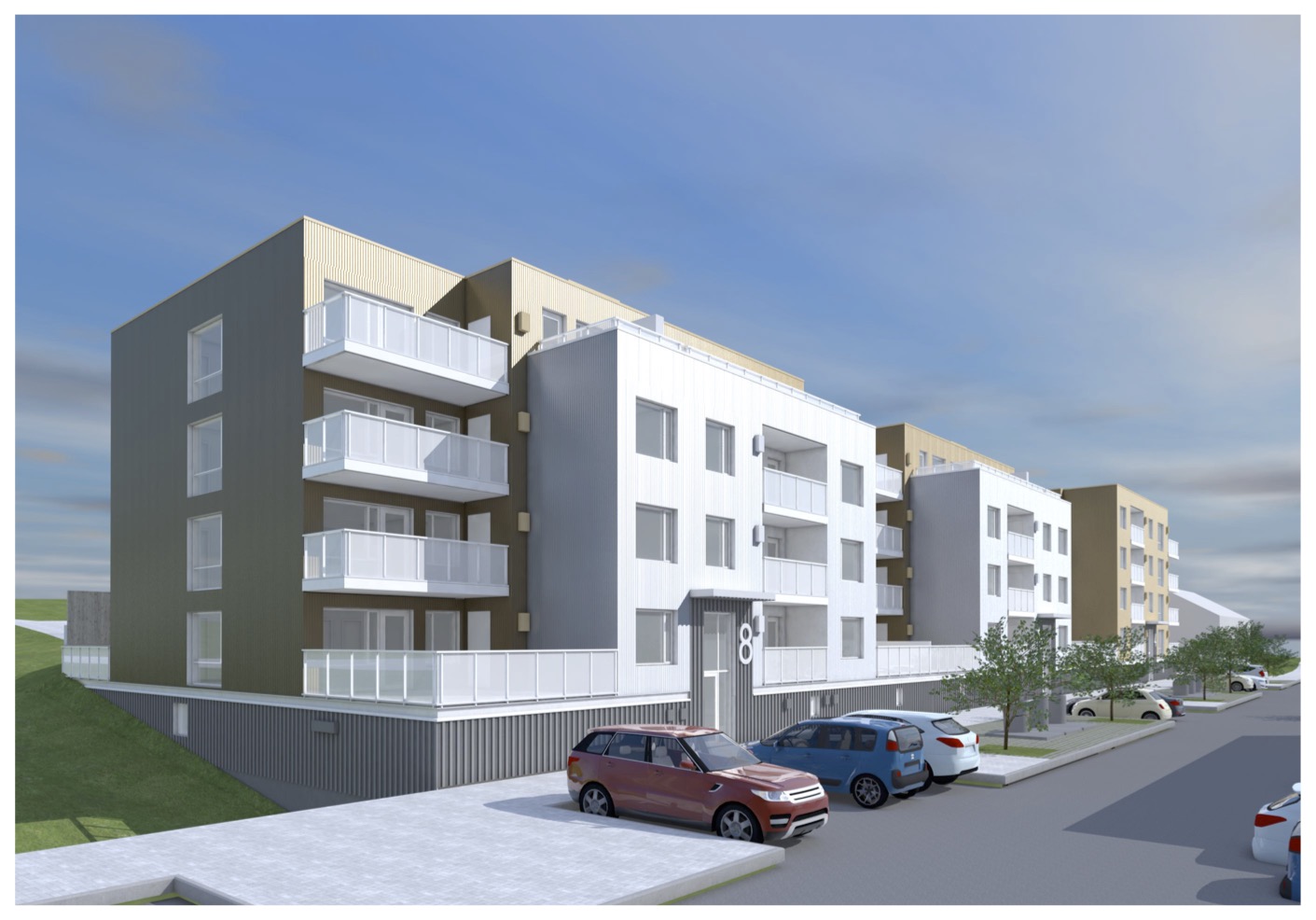 Fjögurra hæða íbúðarhúsnæði með bílageymslu í kjallara. Íbúðir eru í mismunandi stærðum, tveggja til fimm herbergja. Geymslur, tæknirými og bílageymslur eru í inngrafinni jarðhæð. Sameiginlegur garður ofan á bílageymslu. Byggingarnar eru staðsteyptar, einangraðar að utan og klæddar álplötum. Litaðir fletir úthliða skipta byggingunum upp í einingar.