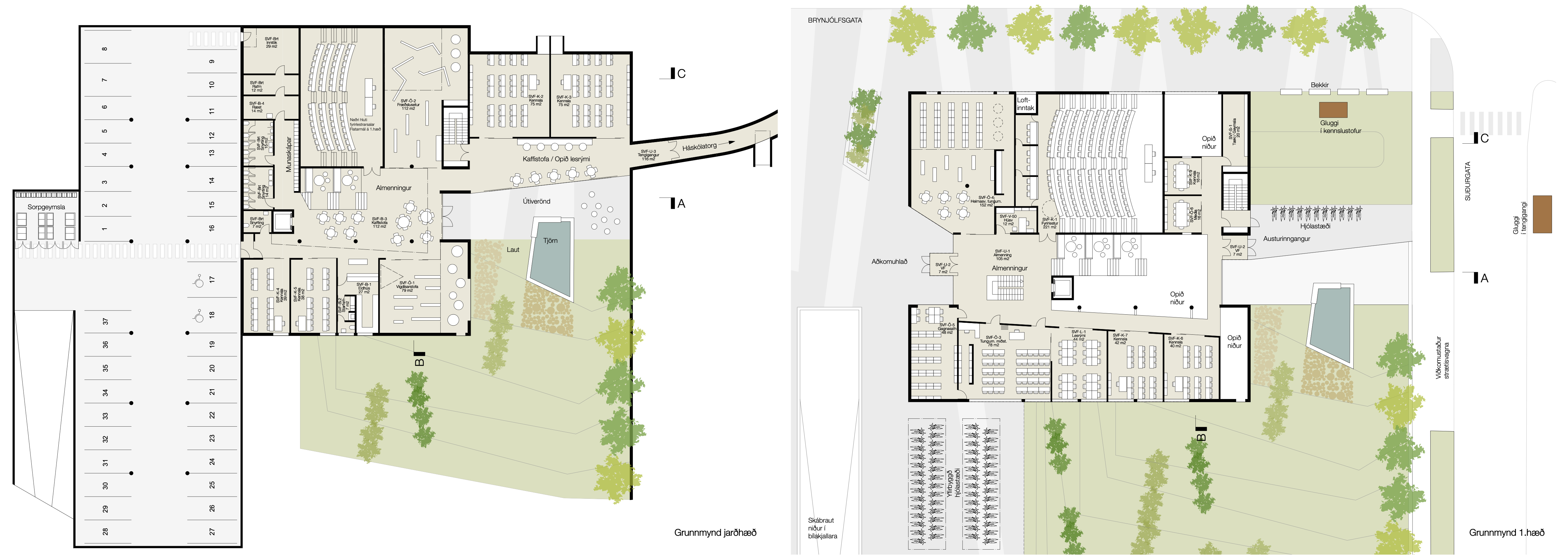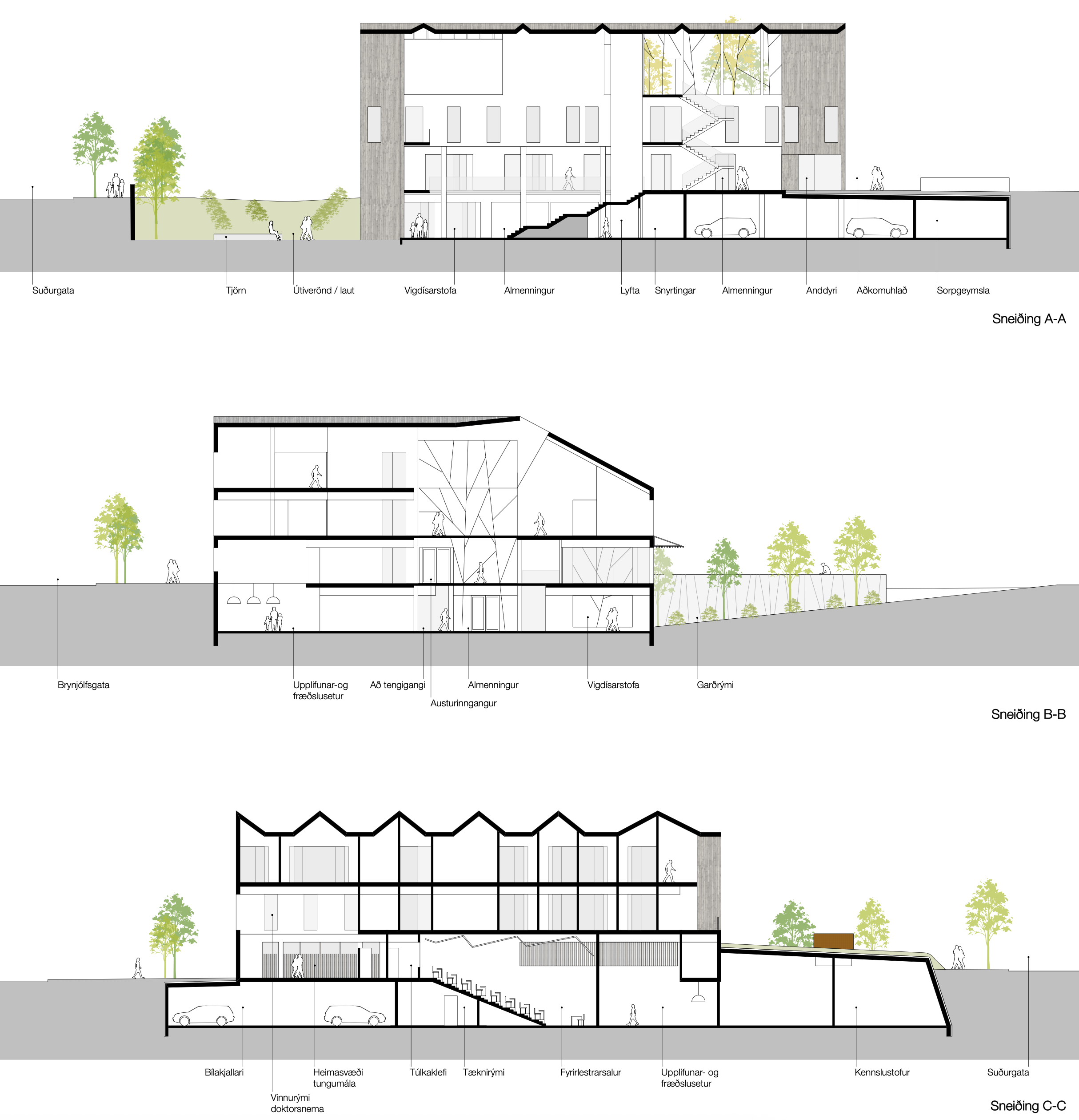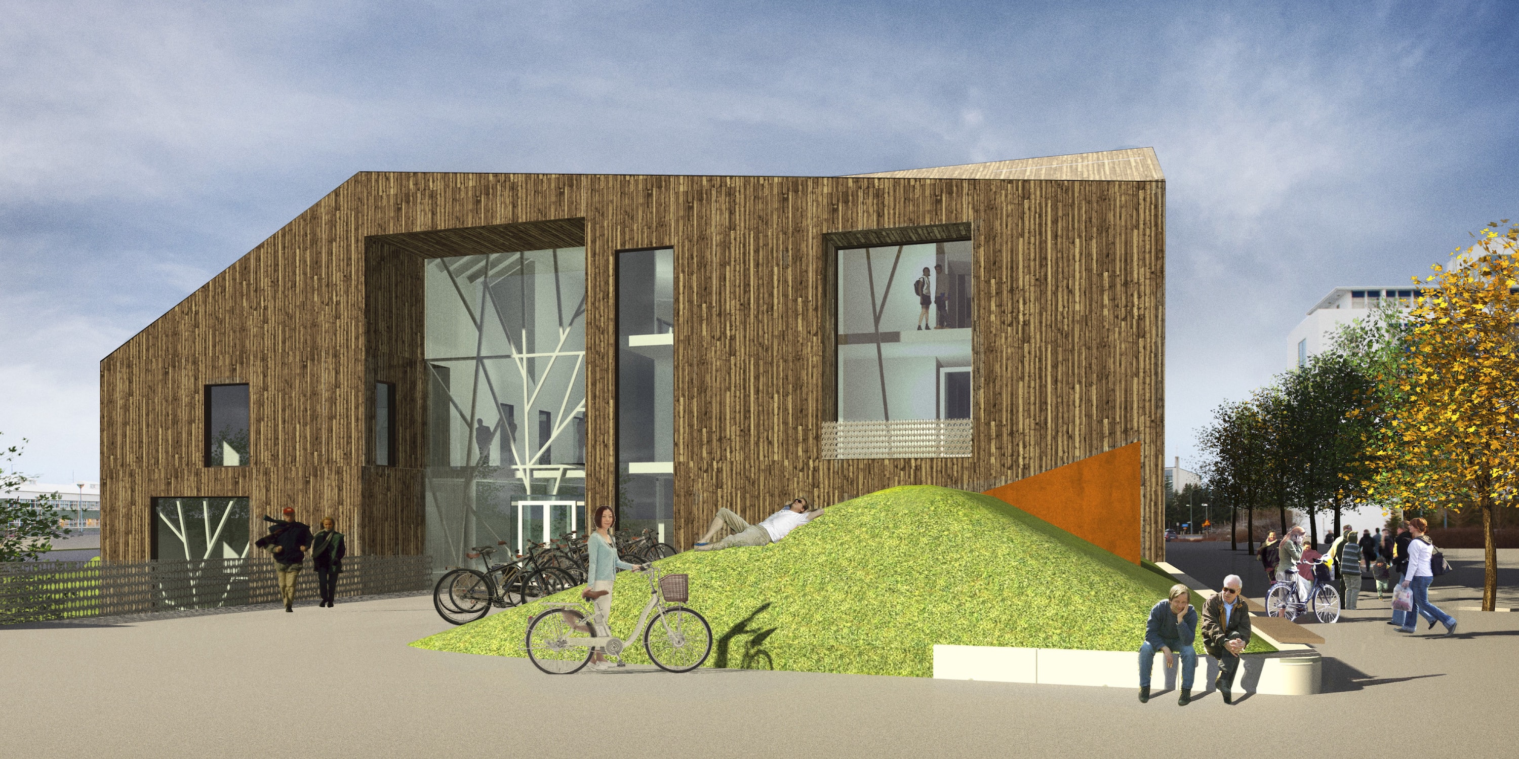 Einfalt grunnform byggingar felur í sér óvænt samspil innri rýma og garða fyrir utan og ofan á byggingunni. Í byggingunni takast á andstæður, dökkt yfirbragð utanhúss en innan dyra er það bjart og rúmgott. Burstir norðurhliðar er skýrskotun til byggingar arfsins, þróunar og skyldleika við erlendan byggingararf.